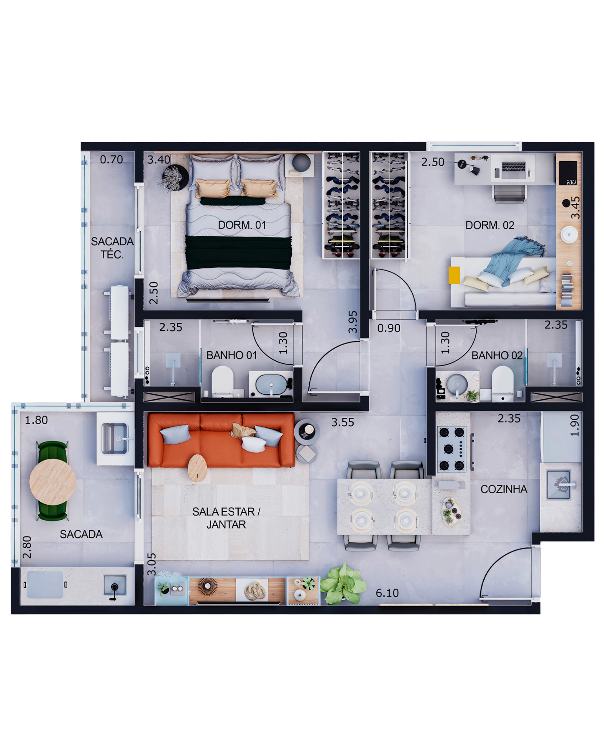 Escolha entre studios modernos a partir de 30,07m² ou apartamentos espaçosos a partir de 61,78m², com opções de 2 dormitórios ideais para sua família ou sua independência.
