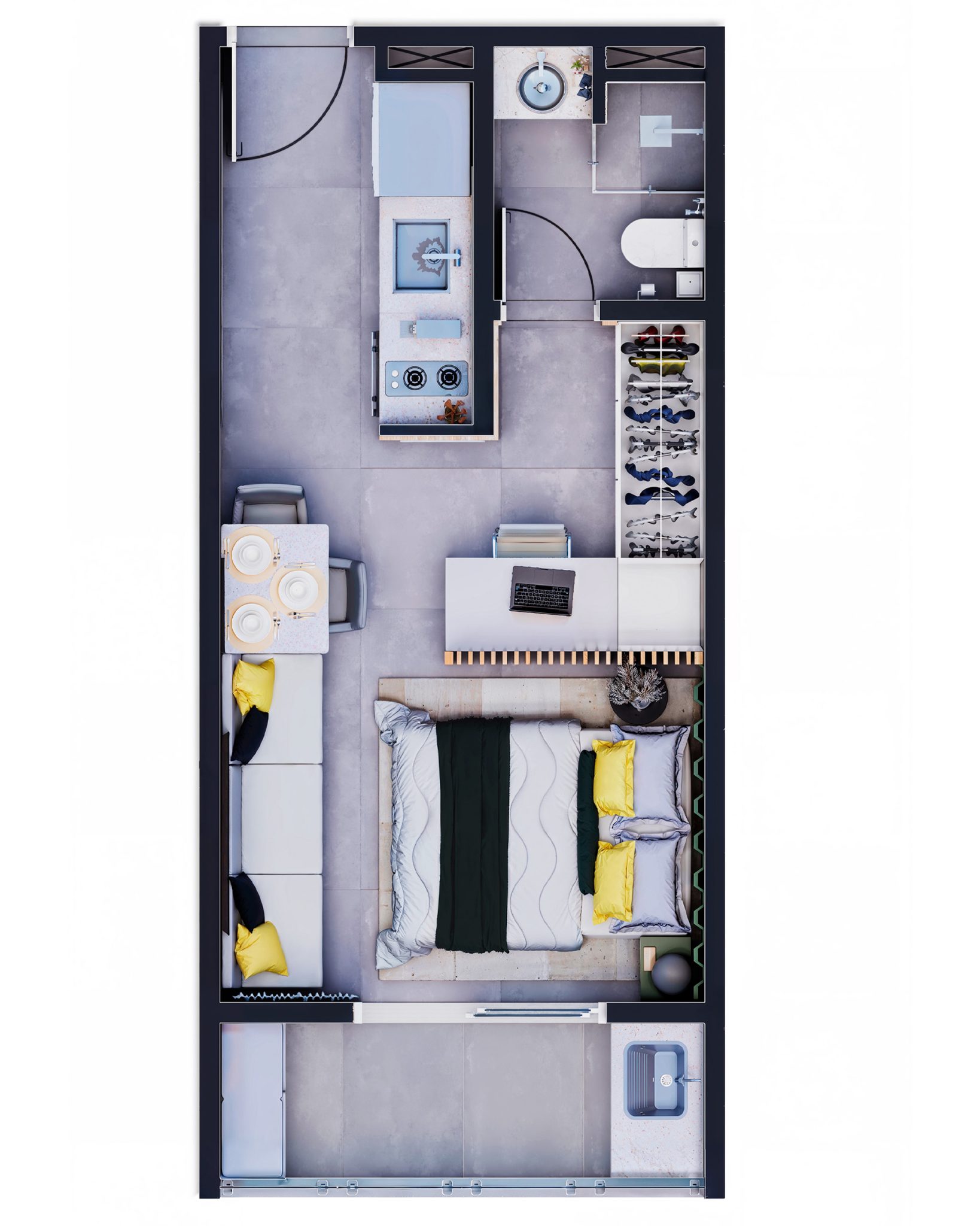 Studios e apartamentos versáteis, aliados a um design contemporâneo, sofisticado e funcional.